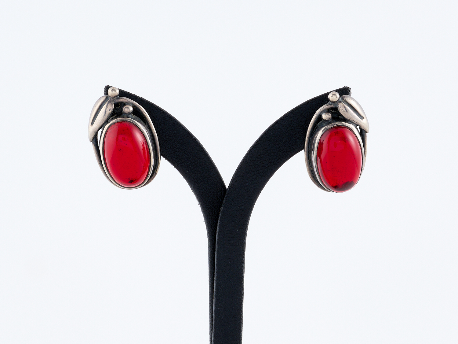 A PAIR OF GLASS AND STERLING SILVER EARRINGS, TO POST AND BUTTERFLY FITTINGS, 25MM X 16MM, RETAILED BY THE METROPOLITAN MUSEUM OF ART, BOXED