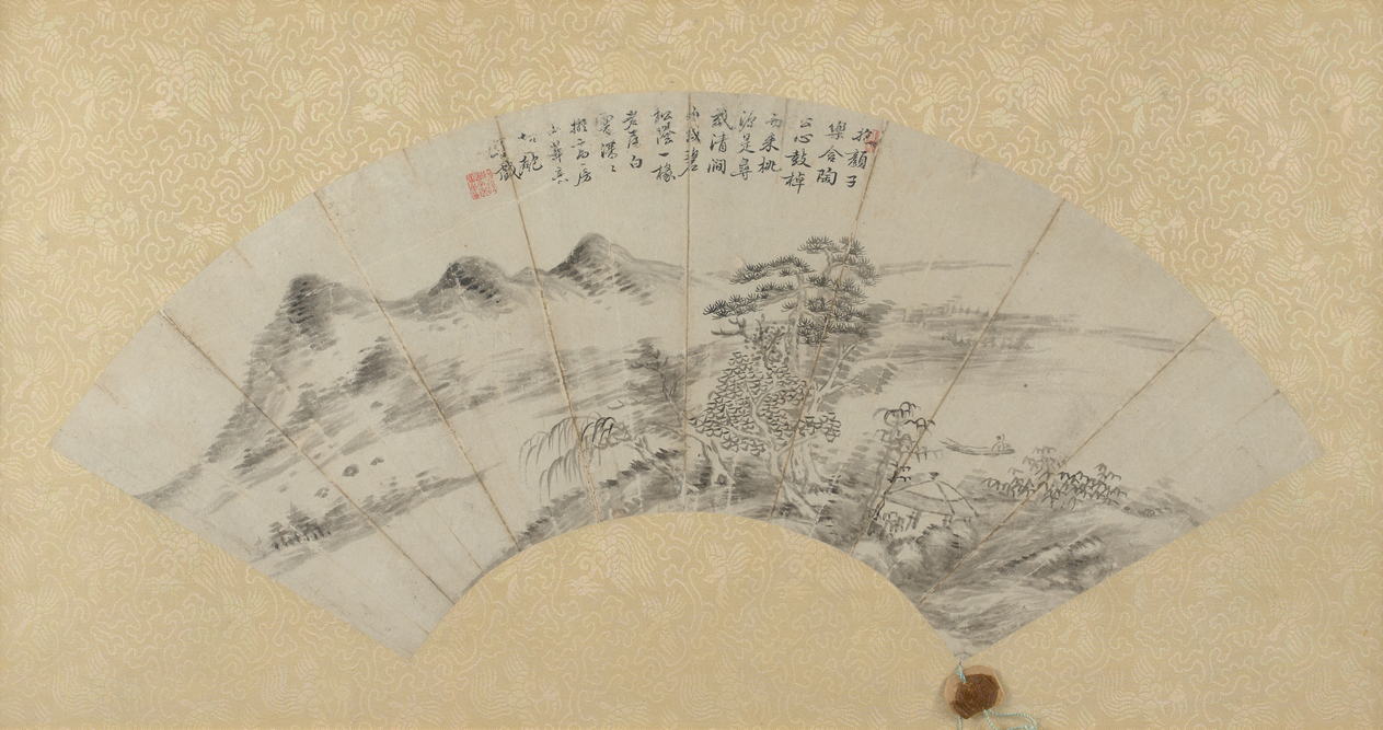 Depicting a classical Chinese landscape in black ink on paper with a calligraphic inscription to the top, mounted on silk brocade backing, framed.