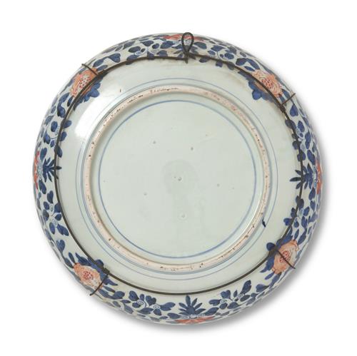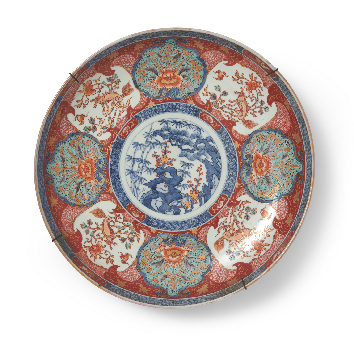 Decorated with a central 'shochikubai' (three friends of winter) roundel surrounded by a large border with shaped reserves, diaper motifs and scrolling foliage. Mounted with an old wire hanging system.