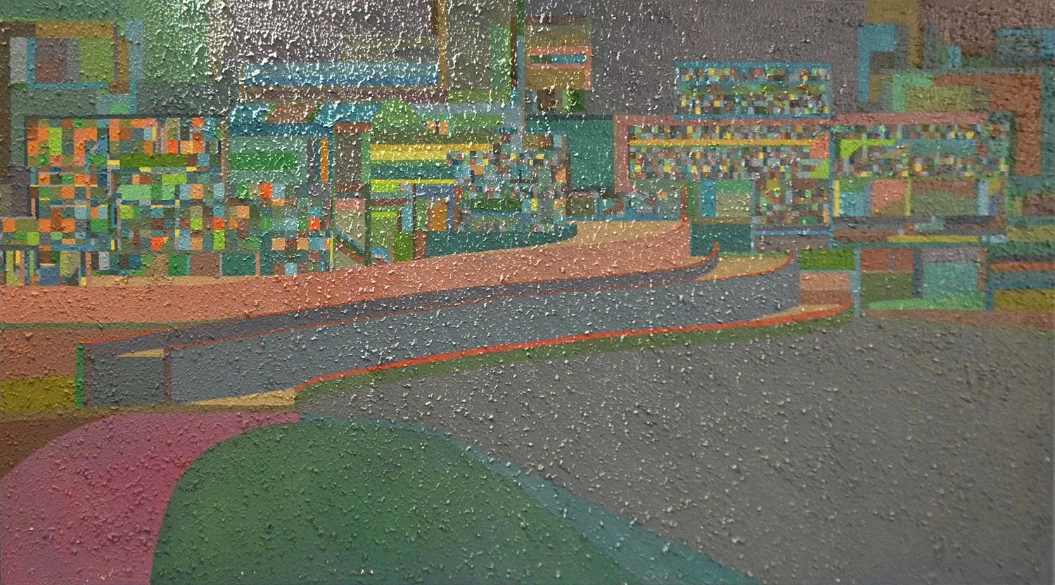 JEFF MAKIN, SLIDING ROCK MINE 1987, OIL ON LINEN, 84 X 112CM, FRAME SIZE: 90 X 118