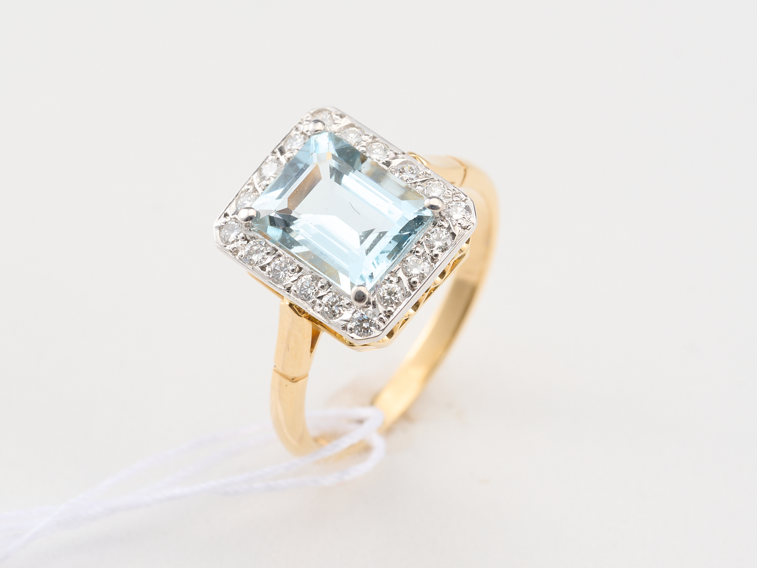 AN AQUAMARINE AND DIAMOND RING IN 18CT GOLD, THE AQUAMARINE TOTALLING 1.92CTS, THE DIAMONDS TOTALLING 0.28CTS, RING SIZE N