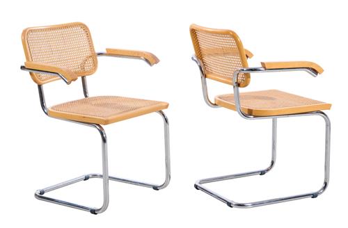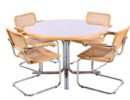 Chrome, glass, cane, metal, and beech. Four chairs and a round dining table.