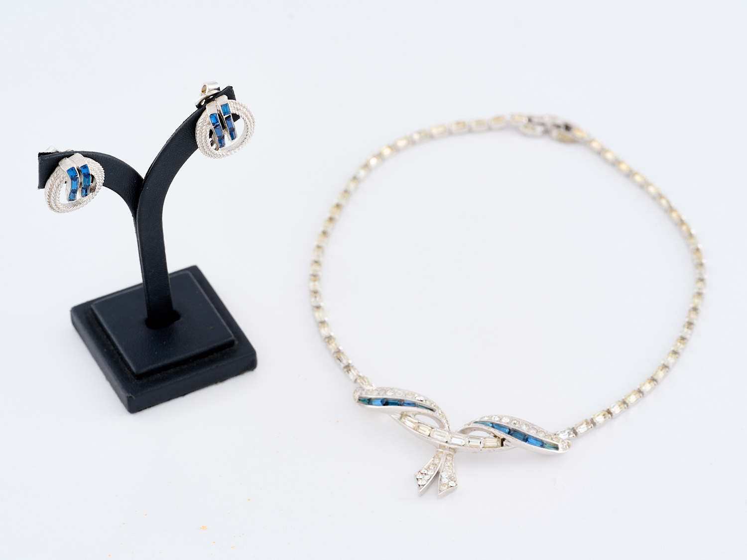 A PAIR OF CLIP ON EARRINGS BY TRIFARI AND COSTUME NECKLACE BY BOUCHER