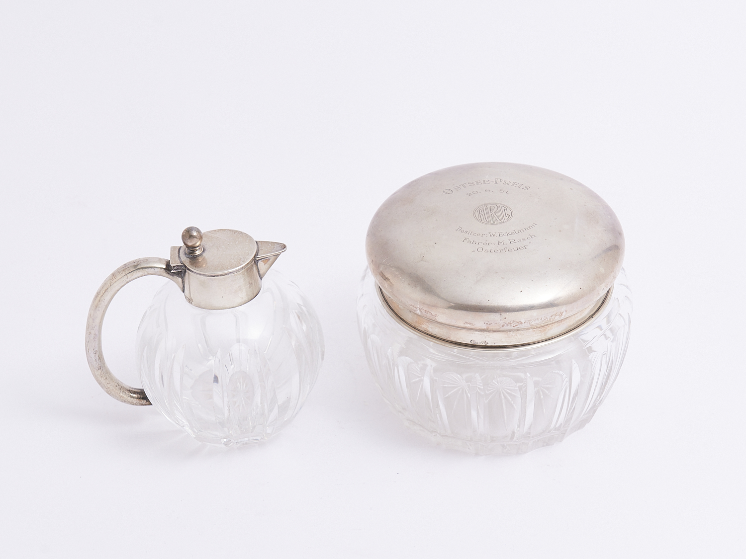 A SMALL GERMAN SILVER 835 TOPPED CRYSTAL CLARET JUG, WITH SMALL MONOGRAM TO SILVER, AND A MATCHING CRYSTAL JAR WITH PRESENTATION INSCRIPTION H.12CM (TALLEST), LEONARD JOEL LOCAL DELIVERY: SMALL