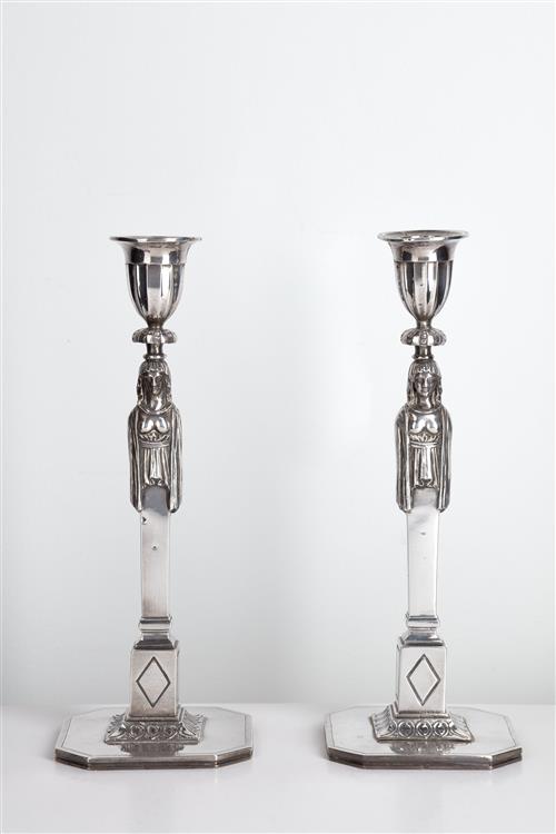 These elegant Viennese silver candlesticks of neo-classical design are dated 1805, the year that Napoleon's army stormed through Europe, ultimately occupying Vienna after the December defeat of the Austrian and Russian armies at the battle of Austerlitz. The fluted urn shaped nozzles are supported by draped female herms suggesting the caryatids (the sculpted figures serving in the place of columns) of the