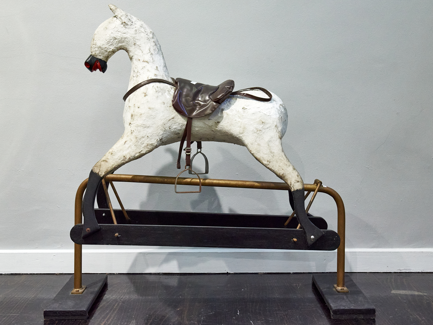 A PAPIER MACHE ROCKING HORSE ON WOODEN BASE (A/F) H.105CM X W.107.5CM X D.45CM, LEONARD JOEL LOCAL DELIVERY: MEDIUM