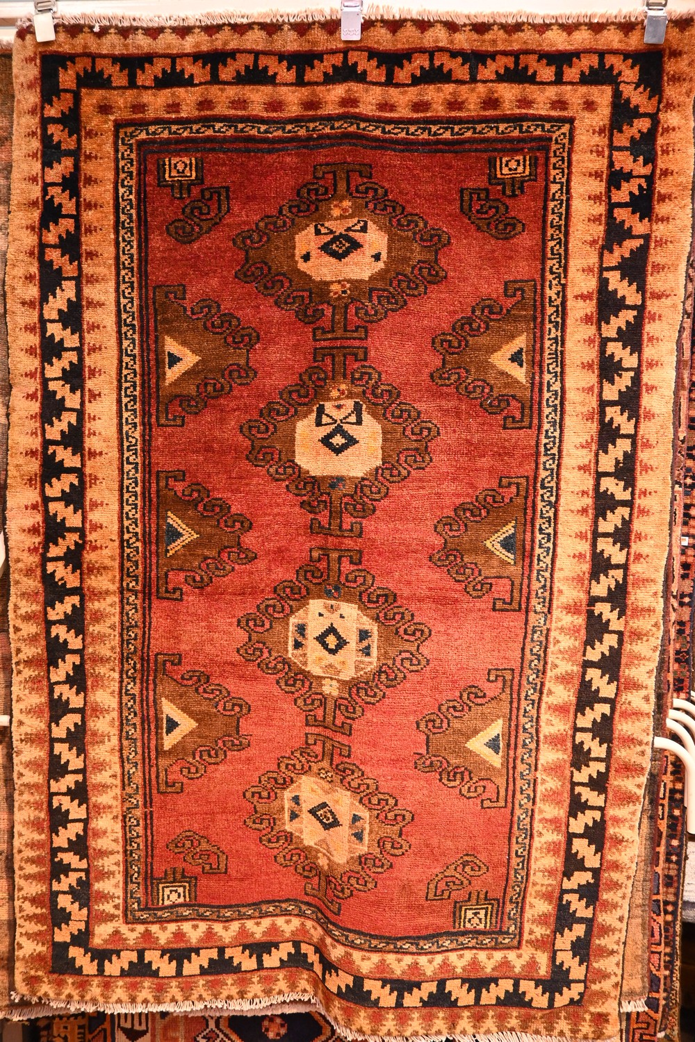A VINTAGE TRIBAL KURDISH RUG. HAND SPUN WOOL, ORGANIC DYES. VILLAGE WEAVE FROM THE KURDISTAN REGION WITH TRIBAL DESIGN OF ELONGATED DECORATIVE MEDALLIONS CONTAINING TRIBAL MOTIFS IN SOFT TONES OF BLUE, CREAM AND PEACH ON A RICH POMEGRANATE FIELD. BORDER OF TRIBAL MOTIFS. SIZE: 174 X 117 CM ORIGIN: IRAN - RRP: $1,400 CERTIFICATE OF AUTHENTICITY INCLUDED.