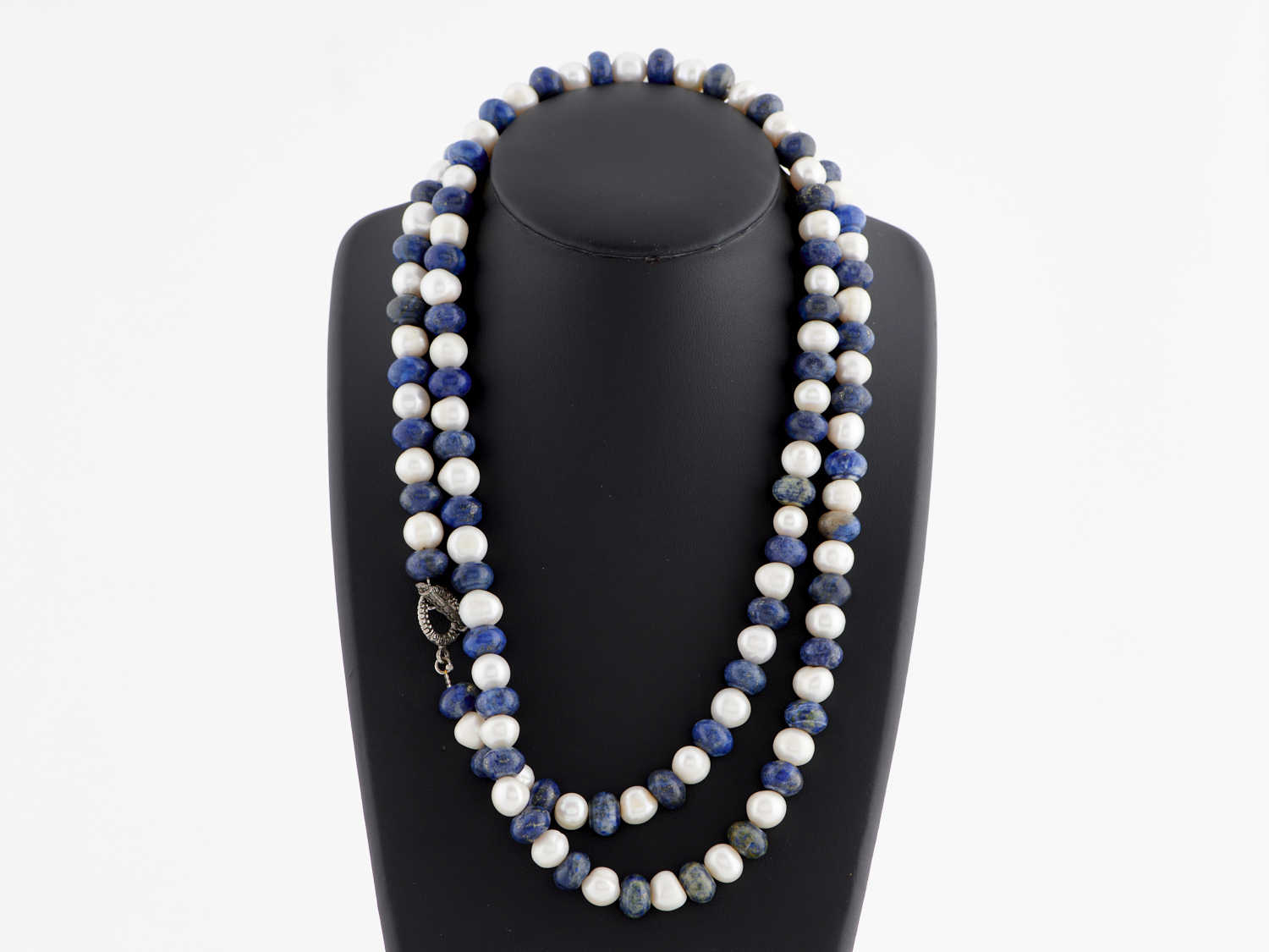 A LONG FRESHWATER PEARL AND LAPIS LAZULI NECKLACE TO A TOGGLE CLASP IN BASE METAL, APPROXIMATE LENGTH 924MM