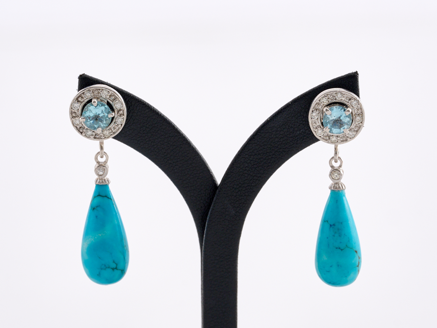 A PAIR OF AQUAMARINE, DIAMOND AND HOWLITE SET DROP EARRINGS IN 18CT WHITE GOLD TO POST AND BUTTERFLY FITTINGS, LENGTH 11.8 X 44MM, WEIGHT 11.2GMS