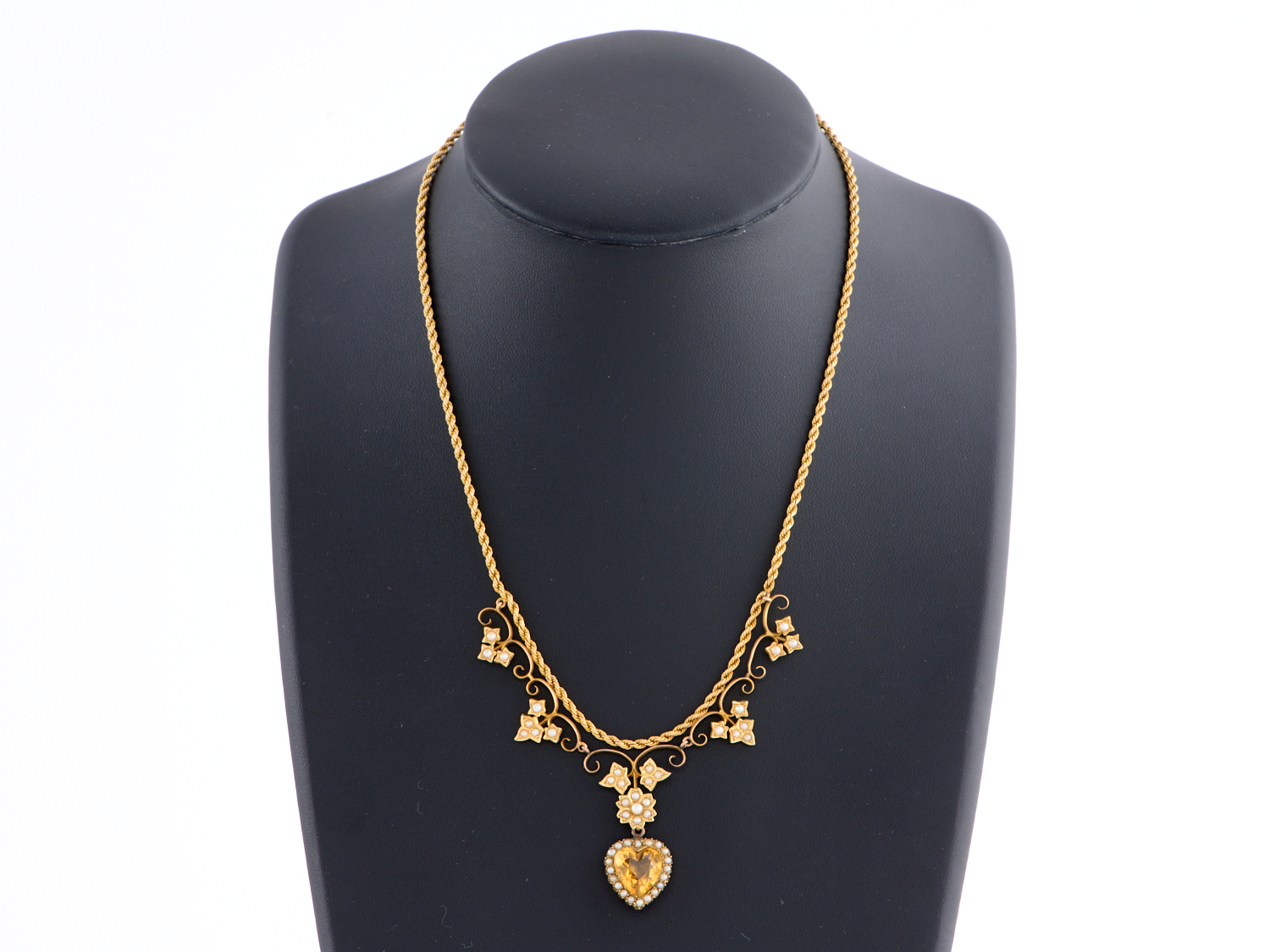 A SEED PEARL AND CITRINE SET CASCADING NECKLACE IN 14CT GOLD, TOTAL LENGTH APPROXIMATELY 400MM, 15.10GMS