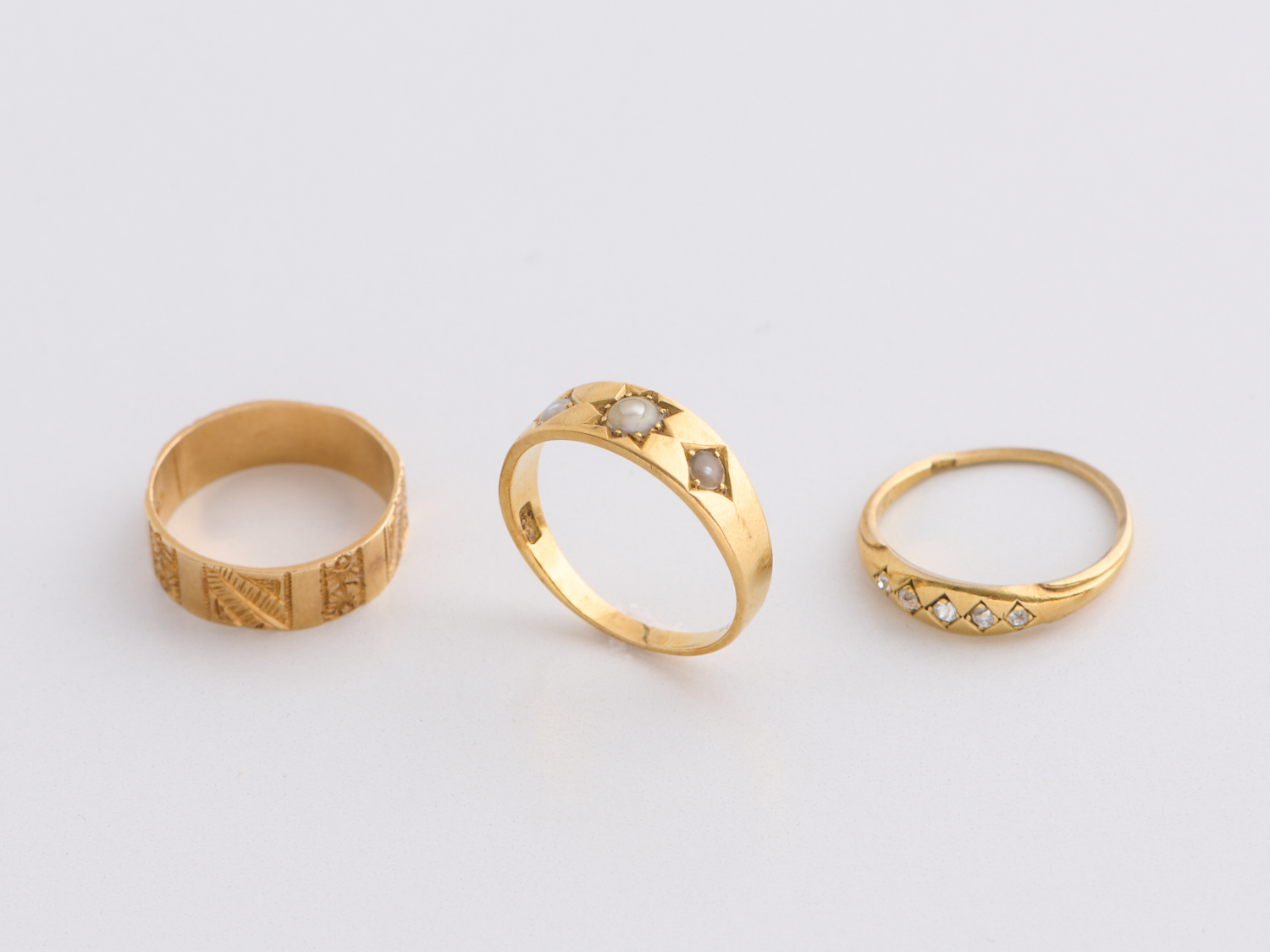 THREE GOLD RINGS IN 18CT GOLD, ONE SEED PEARL SET (SIZE R), ONE DIAMOND SET (SIZE N), THE OTHER SIZE N, TOTAL WEIGHT 10GMS