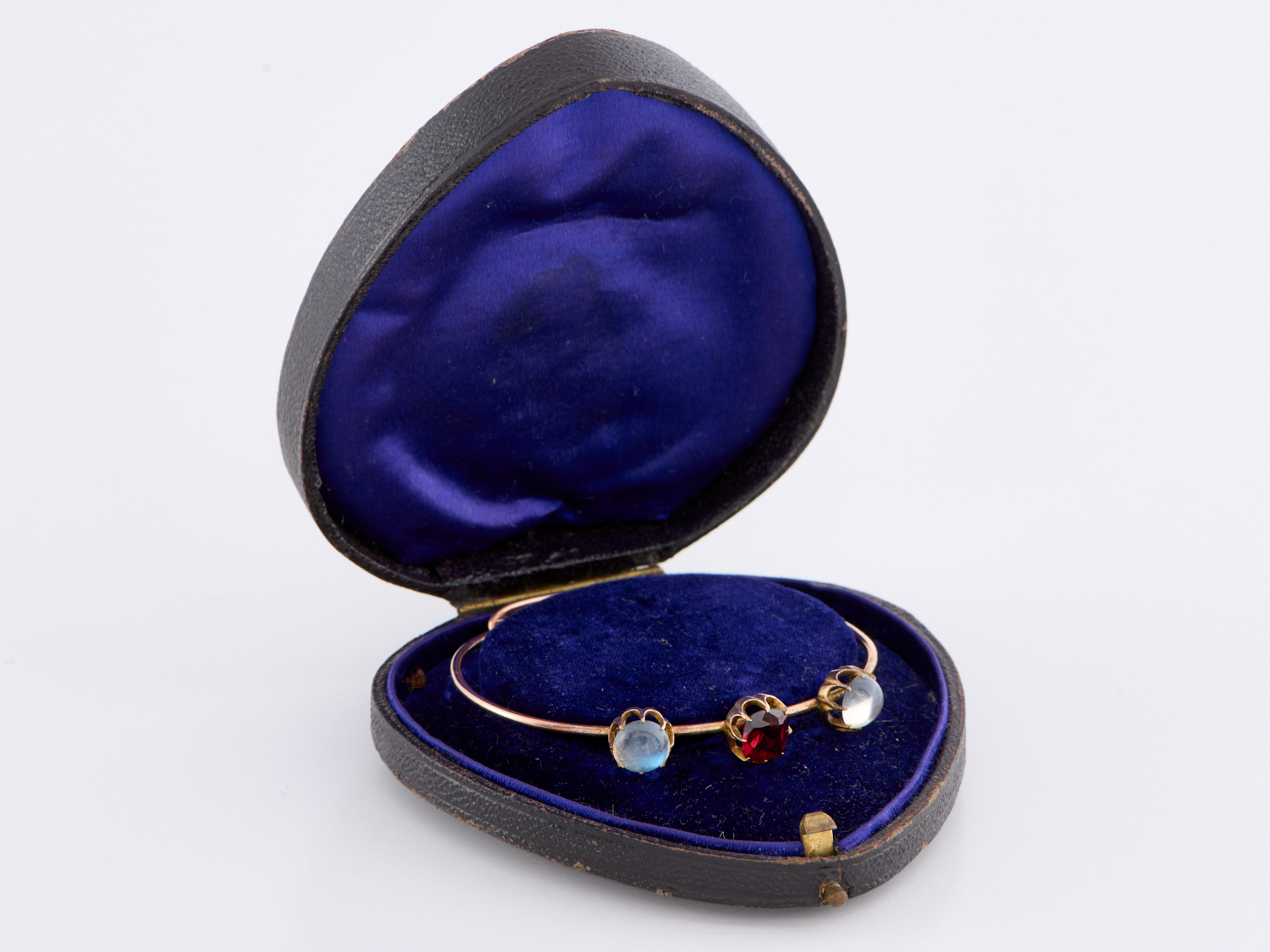AN EDWARDIAN MOONSTONE AND GARNET BANGLE IN BRASS, INTERIOR DIAMETER APPROXIMATELY 60MM