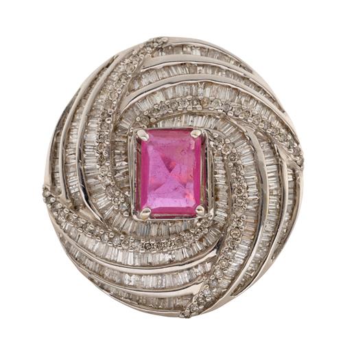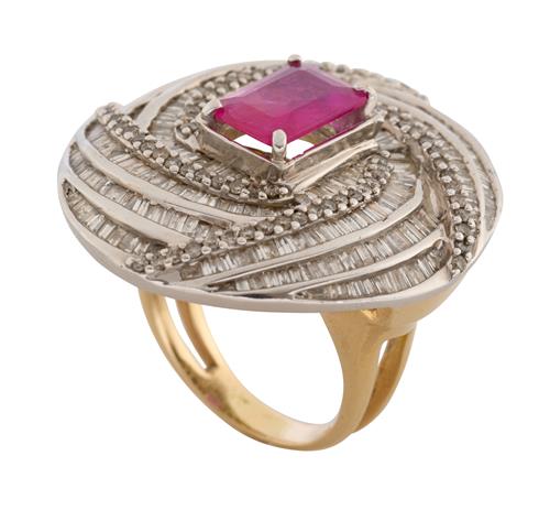 A RUBY AND DIAMOND RING IN TWO-TONE 14CT GOLD, THE RUBY WEIGHING APPROXIMATELY 1.70 CARATS, SIZE P, 17.7GMS
