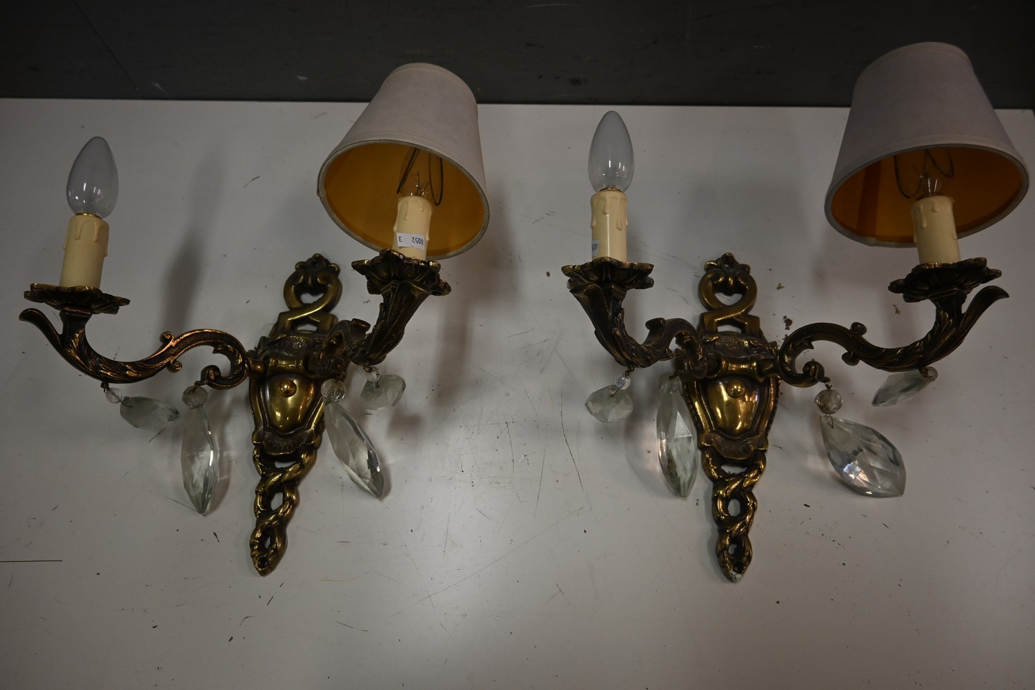 A PAIR OF GILT EFFECT WALL SCONCES (A/F) (36H X 33W CM) (LEONARD JOEL DELIVERY SIZE: MEDIUM)