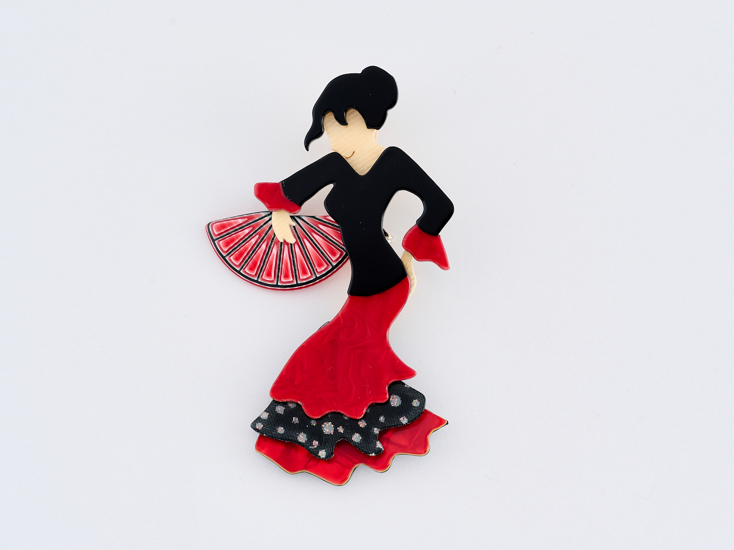 A LADY AND FAN BROOCH BY LEA STEIN, MEASURING APPROXIMATELY 92 X 57MM