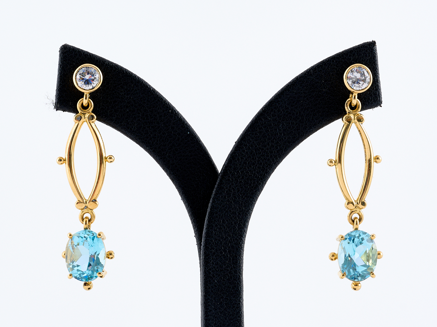 A PAIR OF TOPAZ AND CZ SET DROP EARRINGS TO POST AND BUTTERFLY FITTINGS IN 18CT GOLD, LENGTH 40MM, 7.6GMS