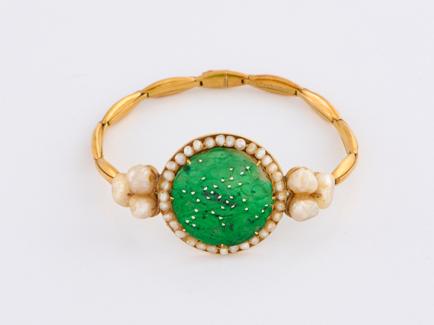 A PEARL AND JADE SET BRACELET IN 22CT GOLD, 18.70GMS
