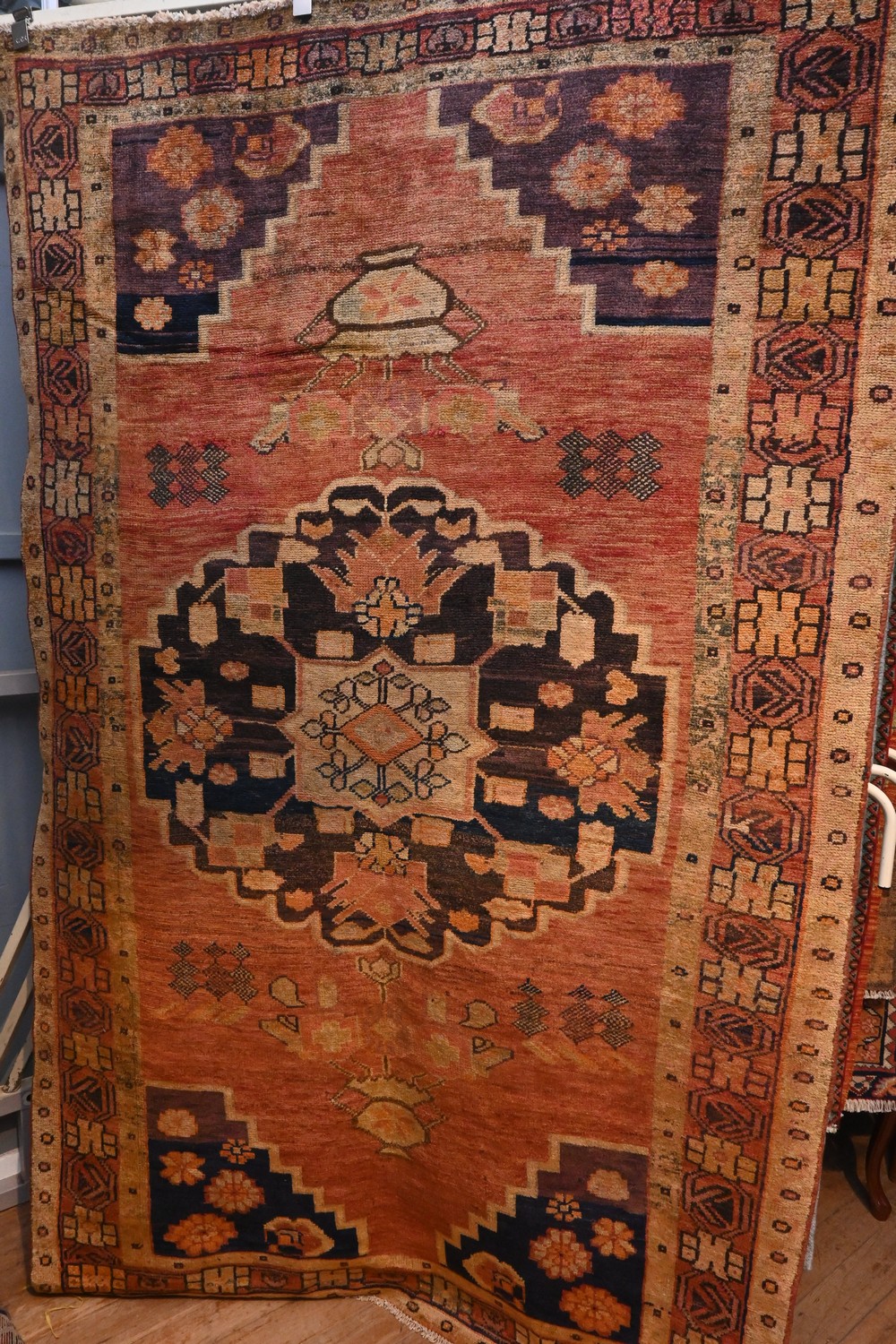 A CIRCA 1960s TRIBAL PERSIAN LURI RUG. 100% WOOL. NATURAL DYES. VINTAGE PILE. HAND-KNOTTED TRIBAL WEAVE WITH DESIGN OF CENTRAL FLORAL MEDALLION ON A SOFT RED FIELD WITH ALL OVER TRIBAL MOTIFS. BORDER OF GEOMETRIC PATTERNS. SOME ABRASH. RESTORED TO GALLERY CONDITION. SIZE: 252 X 160 CM ORIGIN: PERSIA - RRP: $3,500 DOCUMENTATION OF AUTHENTICITY INCLUDED.