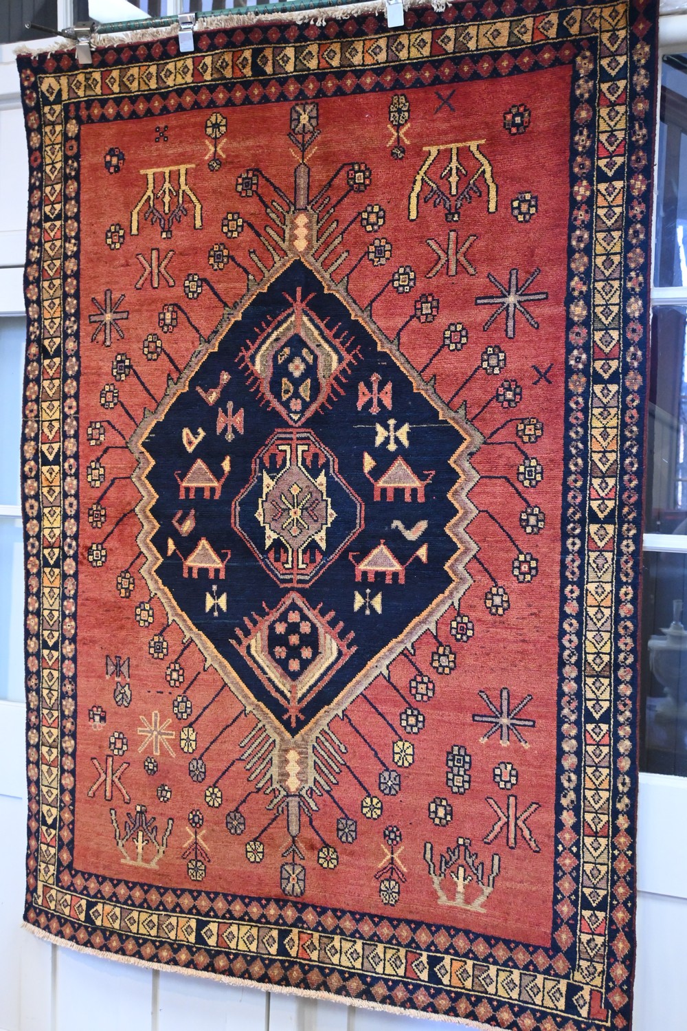A CIRCA 1970'S PERSIAN SIRJAN AFSHAR RUG. 100% WOOL AND ORGANIC DYES, VINTAGE PILE. LARGE HEXAGONAL CENTRAL ELONGATED MEDALLION CONTAINING TRIBAL ANIMAL MOTIFS AND A POMEGRANATE RED FIELD OF ROSETTES. ORIGIN: PERSIA - RRP: $2,100 SIZE: 234 X 152 CM DOCUMENTATION OF AUTHENTICITY INCLUDED.