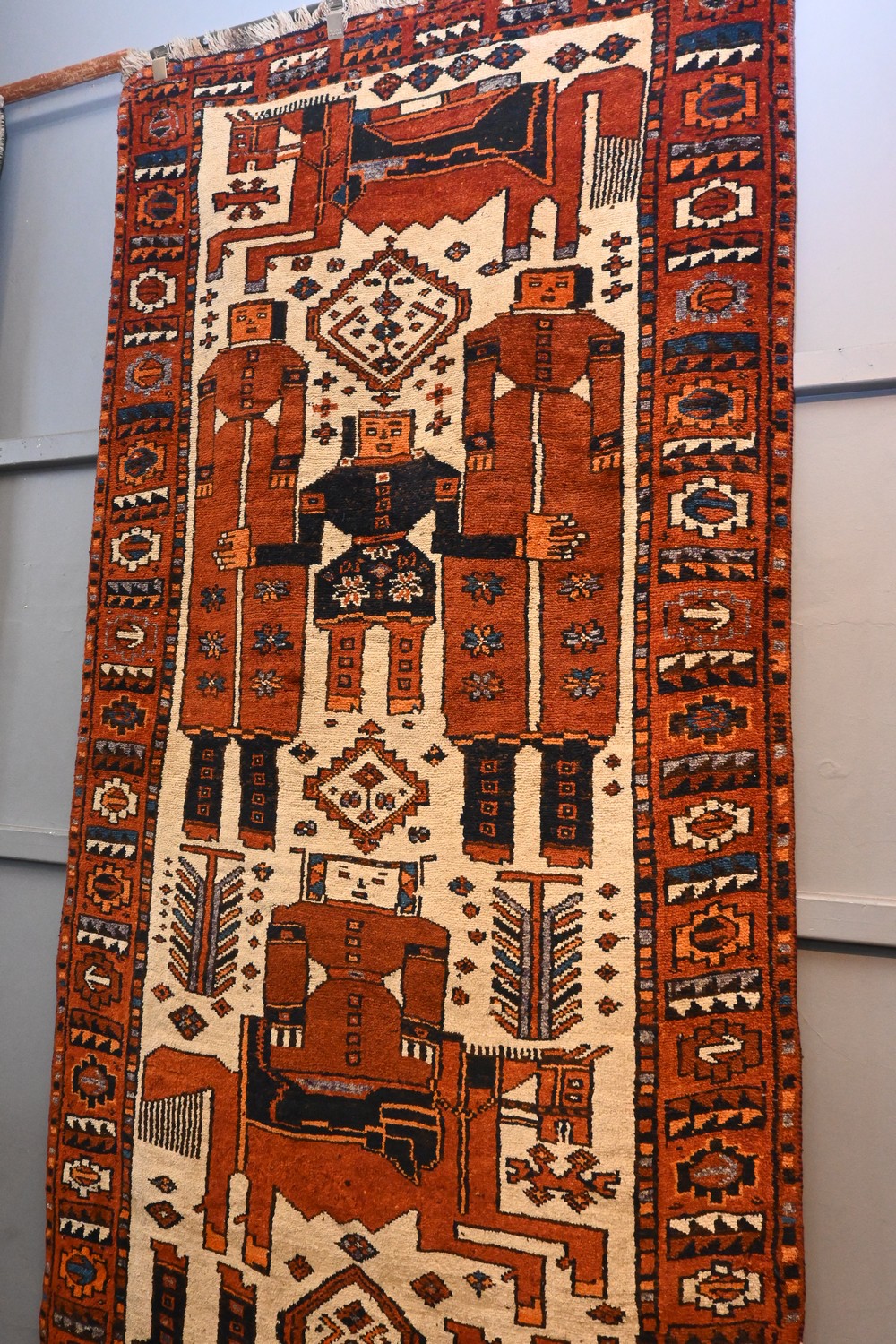 A RARE AND FASCINATING ANTIQUE DESIGN (KING KHOSROW AND QUEEN SHIRIN) PICTORIAL RUG. THIS RARE PICTORIAL ILLUSTRATES AND IMMORTALISES THE LEGENDARY FIRST MEETING OF KHOSROW AND SHIRIN, THE LEGENDARY CROSSED LOVERS WHO DOMINATED PRE-ISLAMIC POLITICS AND ROMANCE IN THE 6TH CENTURY. HE WAS THE SASSANIAN KING OF PERSIA AND SHIRIN WAS THE QUEEN OF ARMENIA AND THEIR FATE WAS TOLD IN AN EPIC POEM BY NIZAMI IN THE 12TH CENTURY. IT IS AND INCREDIBLE HISTORY OF PERSIAN EMPIRE THAT STILL IS STILL EXISTING AMONGST THE PERSIAN TRIBAL WEAVERS SINCE THE 19TH CENTURY, THIS GREAT EXAMPLE WAS WOVEN CIRCA 1960S AND IT IS IN A FANTASTIC GALLERY CONDITION HAND KNOTTED WITH 100% HAND SPUN WOOL AND 100% ORGANIC DYES, WOOLLEN PILE, WARP AND WEFT. VERY COLLECTABLE AND RARE. CARPET. EX GALLERY RUG. SIZE: 370 X 128 CM RRP $6,900 - ORIGIN: IRAN DOCUMENTATION OF AUTHENTICITY INCLUDED.