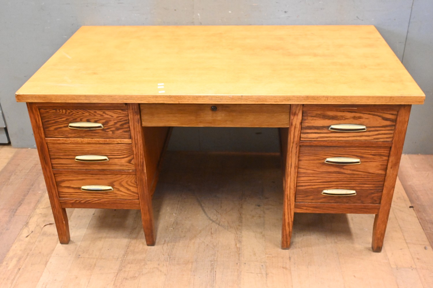 A 1920'S AMERICAN OAK SIX DRAWER DESK (78H X 153W X 87D CM) (PLEASE NOTE THIS HEAVY ITEM MUST BE REMOVED BY CLIENTS OR CARRIERS AT THE CUSTOMERS EXPENSE. LEONARD JOEL STAFF CANNOT ASSIST CARRYING THIS ITEM)