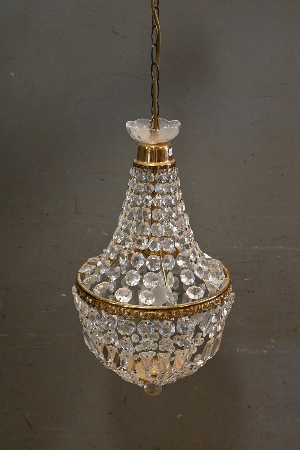 A CUT GLASS AND BRASS BASKET FORM CHANDELIER (AF UNTESTED) (102 CM DROP) (LEONARD JOEL DELIVERY SIZE: LARGE)