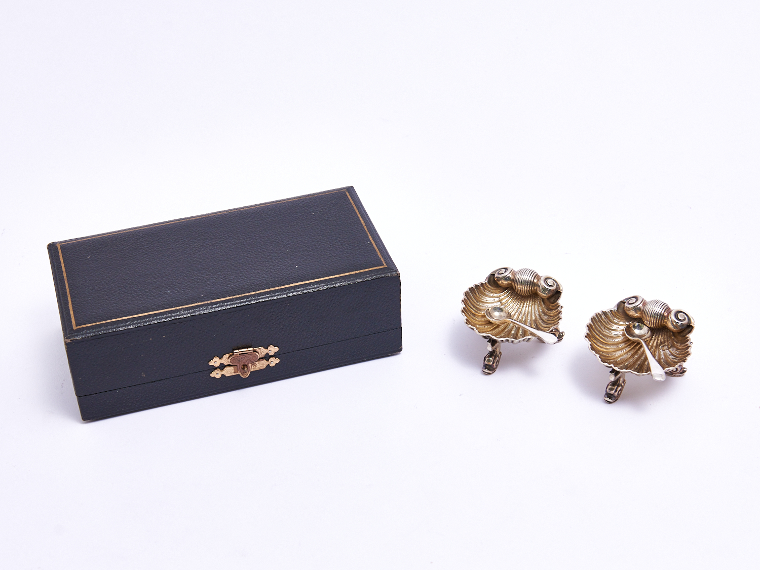 TWO NEPTUNE BASED STERLING SILVER SALTS WITH SPOONS, CASED (SPOONS EP) W.6.5CM, LEONARD JOEL LOCAL DELIVERY: SMALL