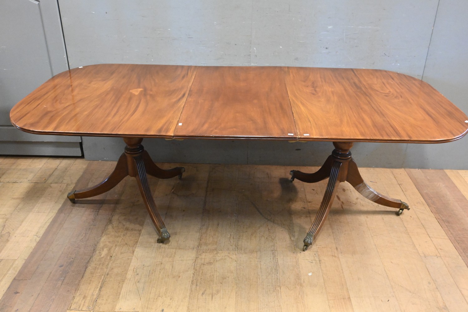 A REGENCY-STYLE MAHOGANY TWIN PEDESTAL EXTENDING DINING TABLE (A/F) (74H X 220W X 107D CM) (PLEASE NOTE THIS HEAVY ITEM MUST BE REMOVED BY CLIENTS OR CARRIERS AT THE CUSTOMERS EXPENSE. LEONARD JOEL STAFF CANNOT ASSIST CARRYING THIS ITEM)