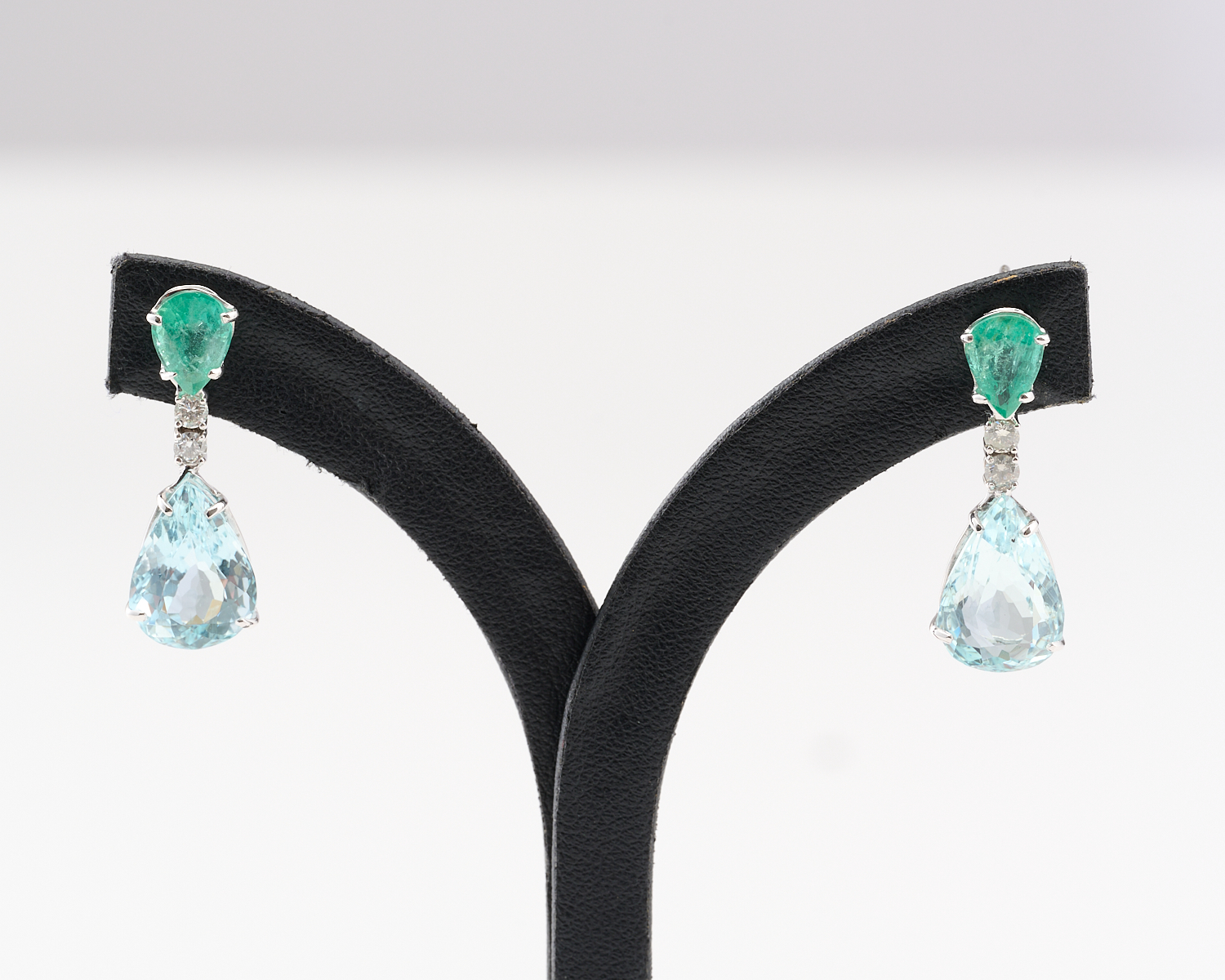 A PAIR OF AQUAMARINE, EMERALD AND DIAMOND EARRINGS IN18CT WHITE GOLD, THE AQUAMARINES TOTALLING APPROXIMATELY 9.68CTS, EMERALDS TOTALLING APPROXIMATELY 2.04CTS AND DIAMONDS TOTALLING APPROXIMATELY 0.20CTS, TO POST AND BUTTERFLY FITTINGS, APPROXIMATE WEIGHT 4.9GMS
