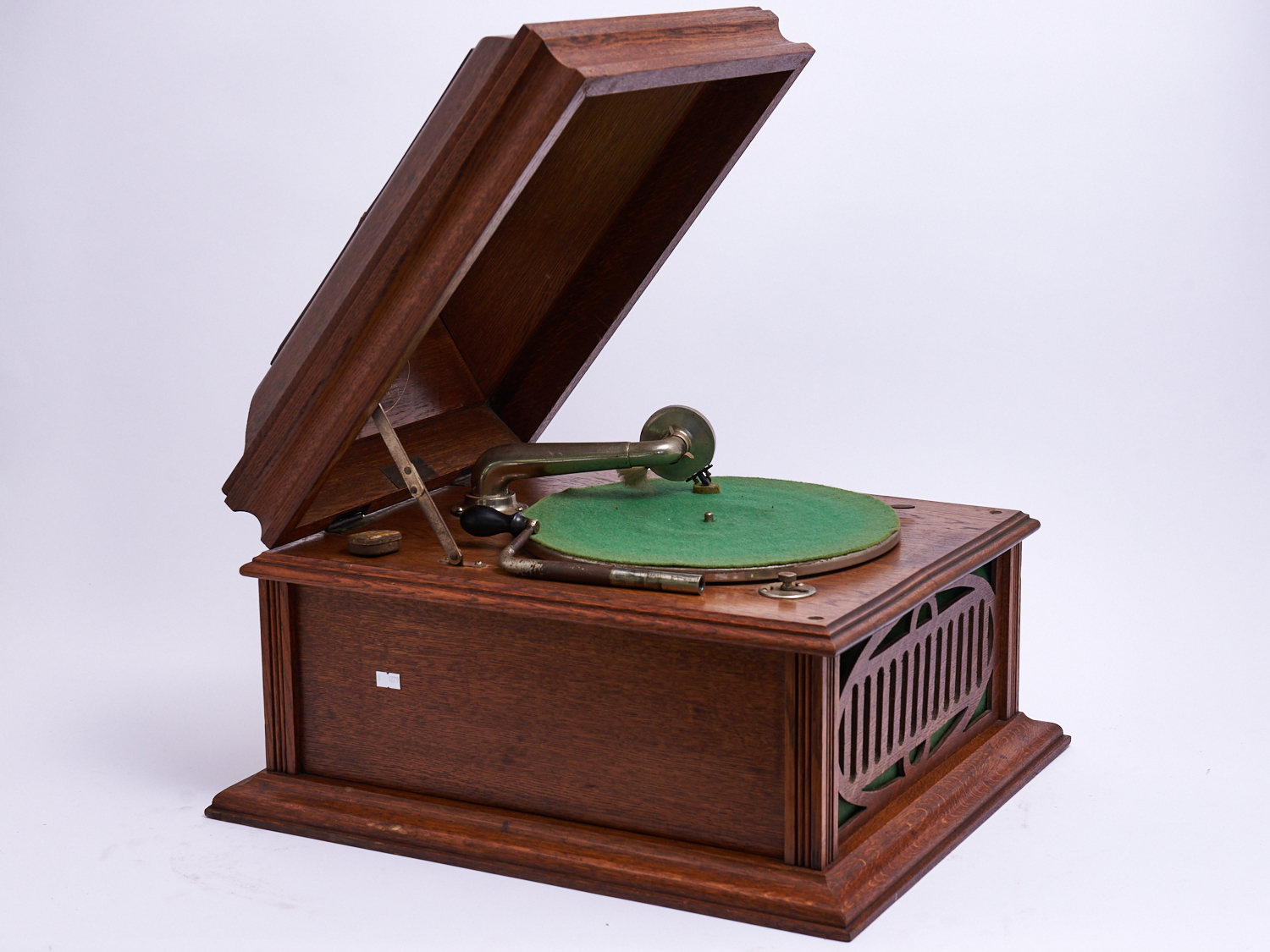 AN ENGLISH OAK CASED SINGOLA GRAMAPHONE, RETAILED BY SUTTONS BOURKE ST MELBOURNE H.34CM X W.55.5CM X D.48CM, LEONARD JOEL LOCAL DELIVERY: MEDIUM