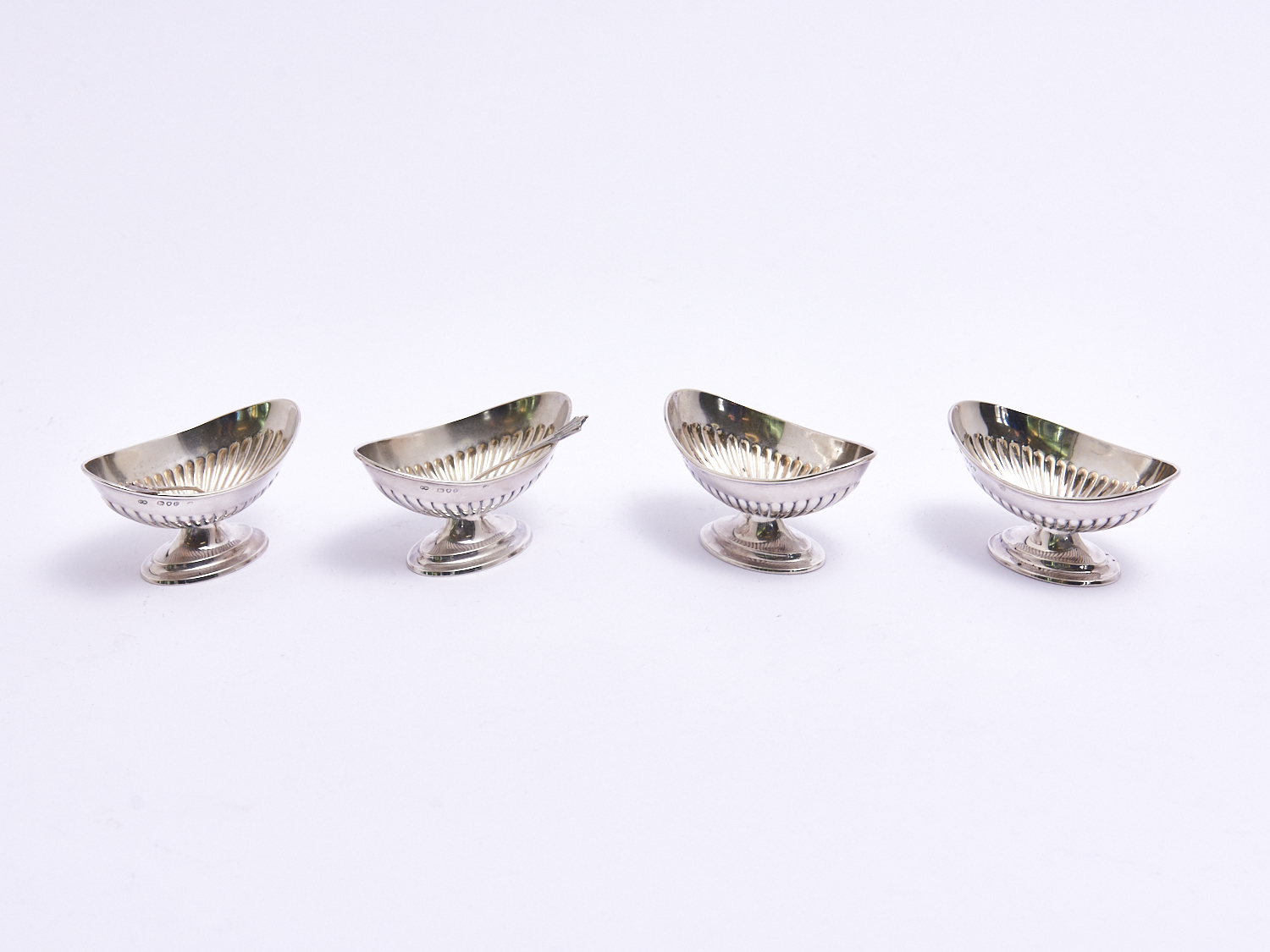 A SET OF FOUR FLUTED SALTS HALLMARKED LONDON 1890 BY CHARLES BOYTON AND SON TOGETHER WITH TWO MATCHING SALT SPOONS. APPROX 218 GRAMS, LEONARD JOEL LOCAL DELIVERY: SMALL