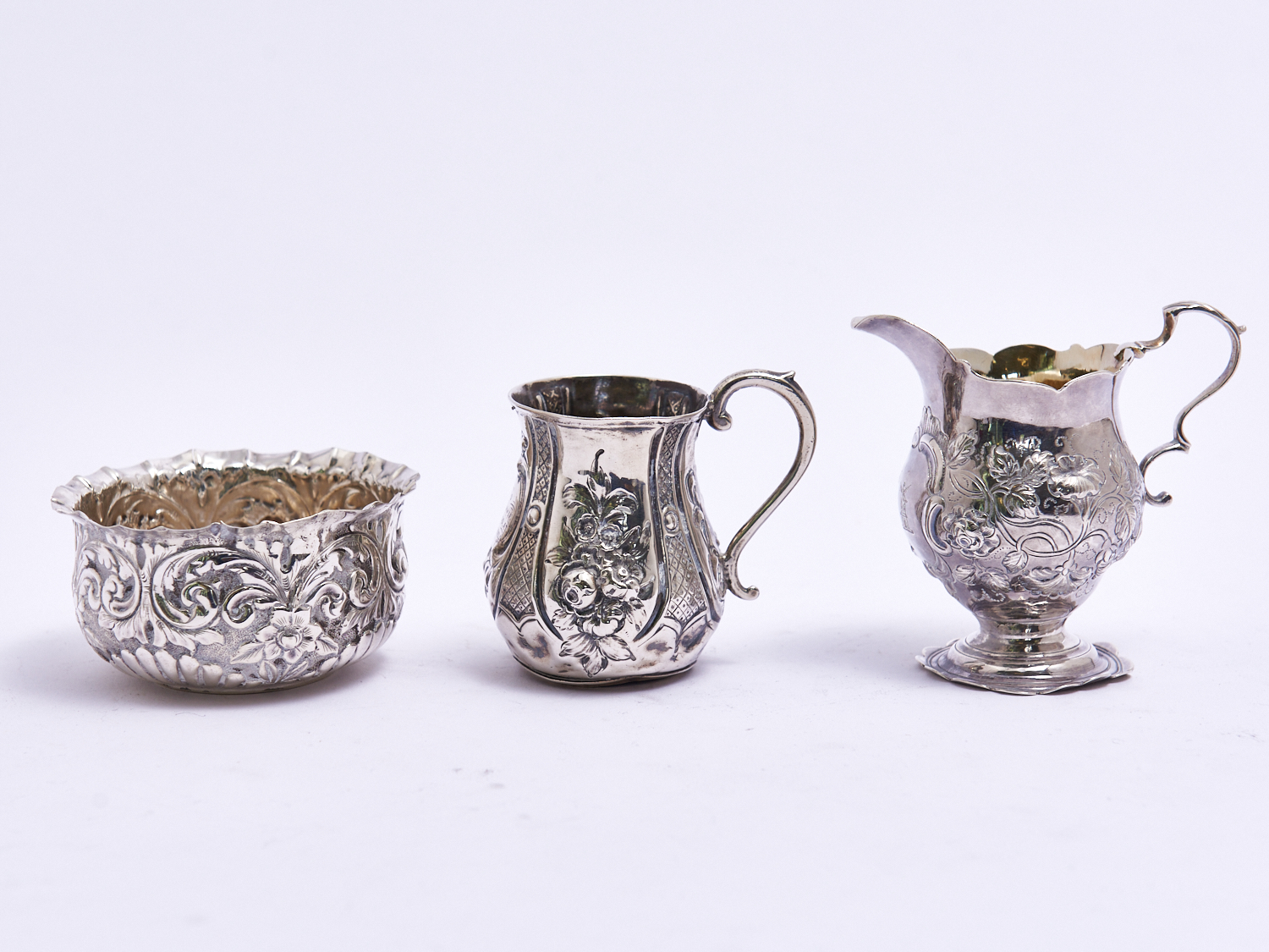 A GROUP OF ORNATE STERLING SILVER INCLUDING TWO JUGS AND A BOWL H.8.5CM (LARGEST), LEONARD JOEL LOCAL DELIVERY: SMALL