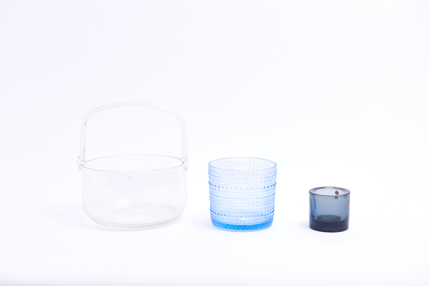 A GROUP OF FINNISH GLASS INCLUDING NUUTAJARVI NOTSJO SARGASSO BASKET BY KAJ FRANCK, AND IITALA KASTEHELMI VASE BY OIVA TOIKKA AND IITALA/MARIMEKKO KIVI CANDLE HOLDER BY HEIKKI ORVOLA, LEONARD JOEL LOCAL DELIVERY: SMALL