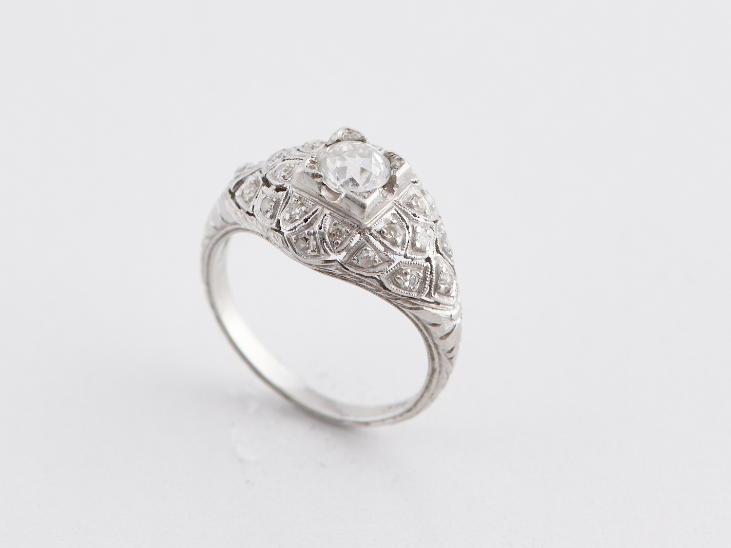AN ART DECO DIAMOND RING IN PLATINUM, THE CENTRAL DIAMOND WEIHGING APPROXIAMTELY 0.55 CARATS, SIZE N, 4.8GMS