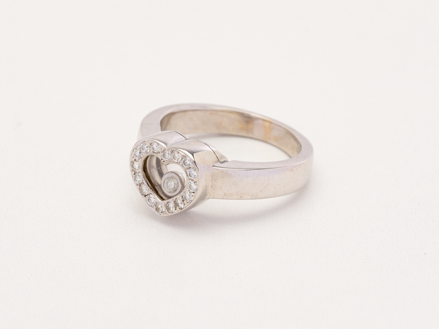 A FLOATING DIAMOND HEART RING IN 18CT WHITE GOLD, RING SIZE K, ESTIMATED DIAMOND WEIGHT 0.20CTS, 7.61GMS