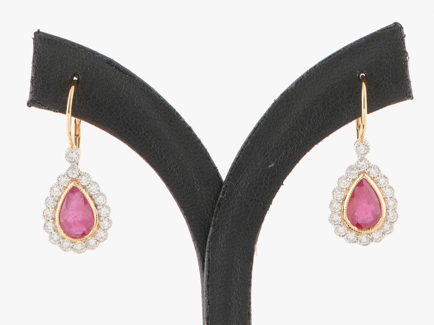 A PAIR OF RUBY AND DIAMOND EARRINGS IN 18CT GOLD, TO POST AND LEAVER BACK FITTINGS, THE RUBIES TOTALLING 2.15CTS