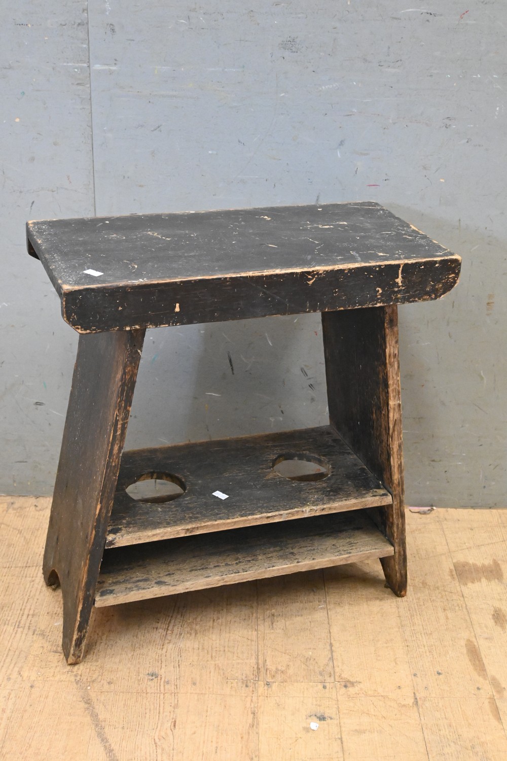 A VINTAGE INDUSTRIAL TWO TIER STOOL (A/F) ( 58H X 53W X 26D CM) (LEONARD JOEL DELIVERY SIZE: LARGE)
