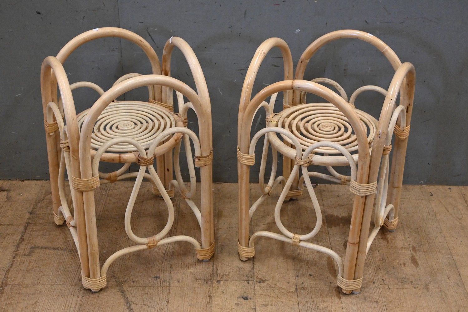 A PAIR OF CANE PLANT STANDS ( 57H X 35W X 35D CM) (LEONARD JOEL DELIVERY SIZE: MEDIUM)