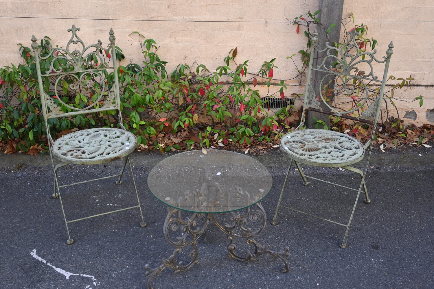 A CAST IRON THREE PIECE SETTING WITH GLASS TOP (A/F) (41H X 70D CM) (LEONARD JOEL DELIVERY SIZE: LARGE)