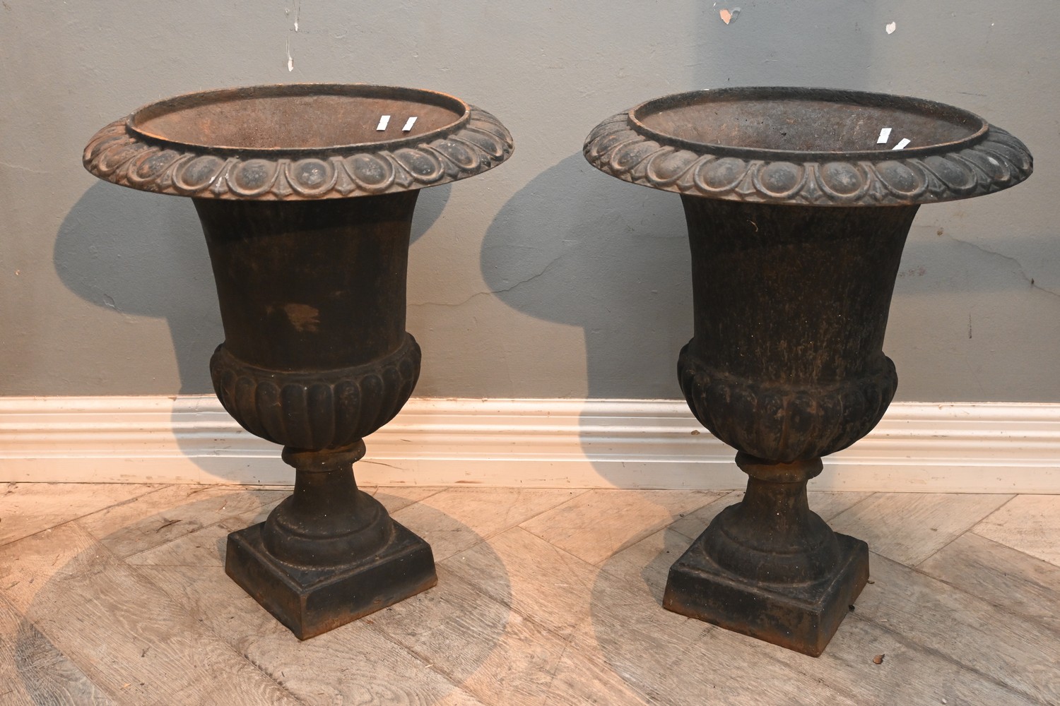 A PAIR OF CAST IRON GARDEN URNS (A/F) (63H X 52D CM) (PLEASE NOTE THIS HEAVY ITEM MUST BE REMOVED BY CARRIERS AT THE CUSTOMER'S EXPENSE. LEONARD JOEL STAFF CANNOT ASSIST CARRYING THIS ITEM) (X-LARGE ITEM)