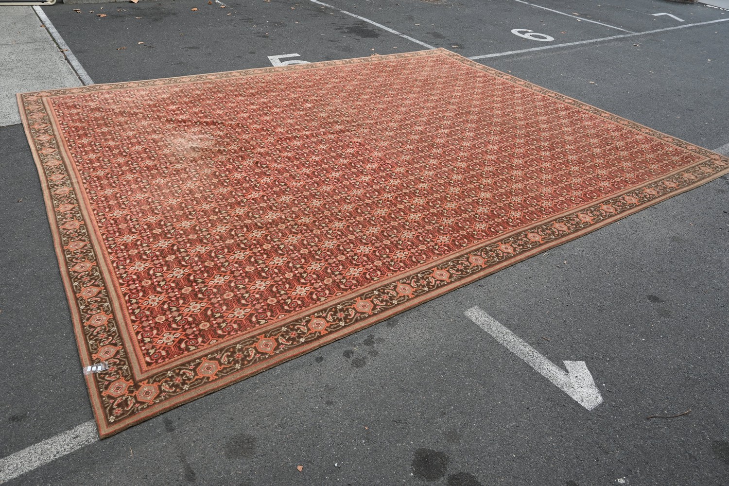 A LARGE DECORATIVE RUG BY BERUZ FOR STUART RATTLE (A/F) ( 497 x 395 CM) (PLEASE NOTE THIS HEAVY ITEM MUST BE REMOVED BY CARRIERS AT THE CUSTOMER'S EXPENSE. LEONARD JOEL STAFF CANNOT ASSIST CARRYING THIS ITEM) (X-LARGE ITEM)