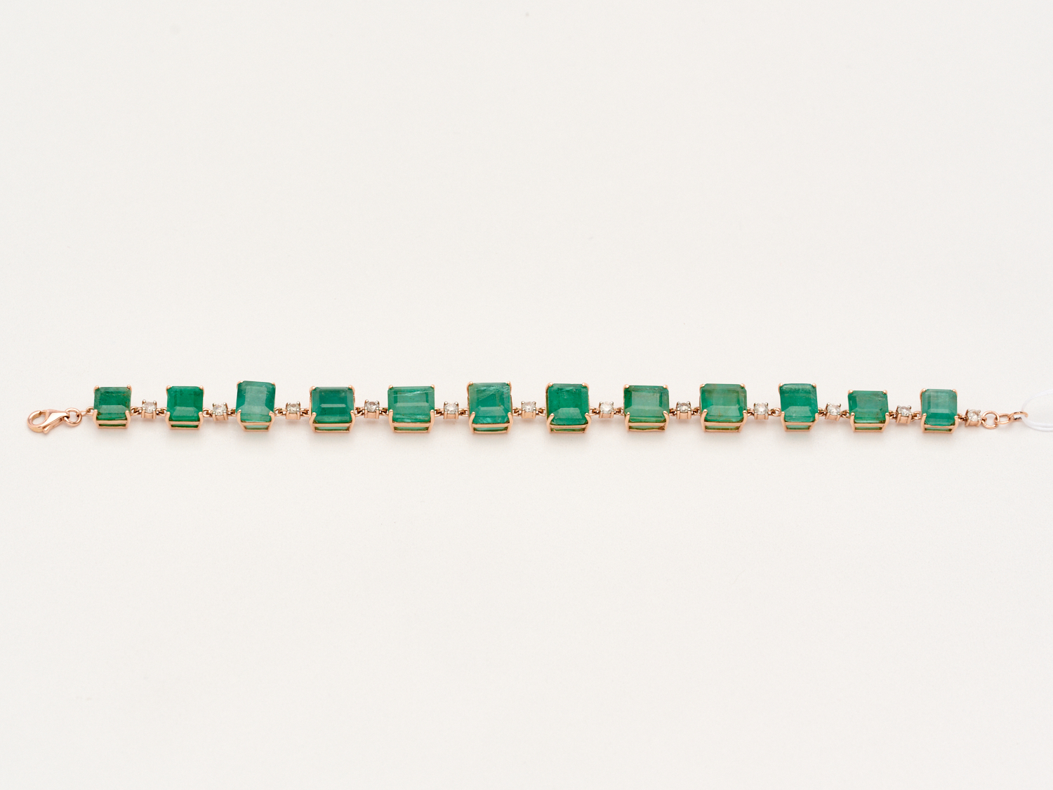AN EMERALD AND DIAMOND CHAIN BRACELET IN 14CT ROSE GOLD, THE EMERALDS TOTALLING 27.24CTS, LENGTH 170MM