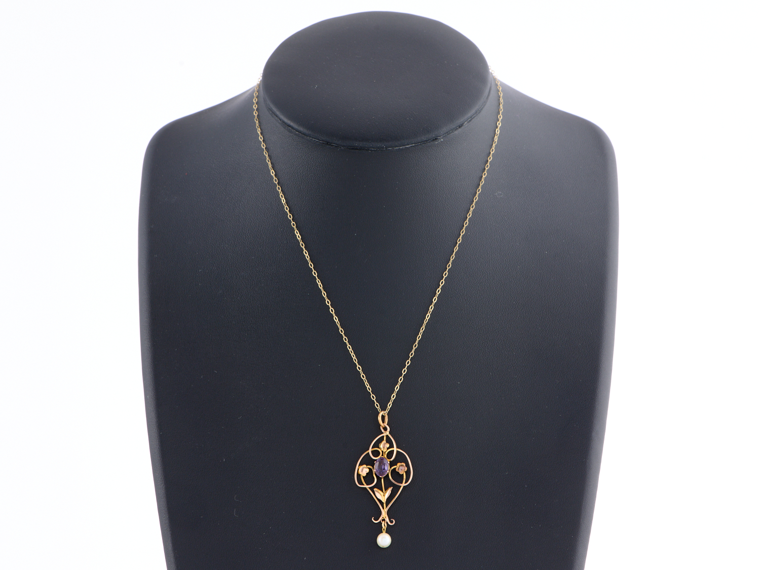 AN ART NOUVEAU AMETHYST & PEARL PENDANT IN 9CT GOLD TO A FINE CHAIN IN 9CT GOLD, 1.81GMS