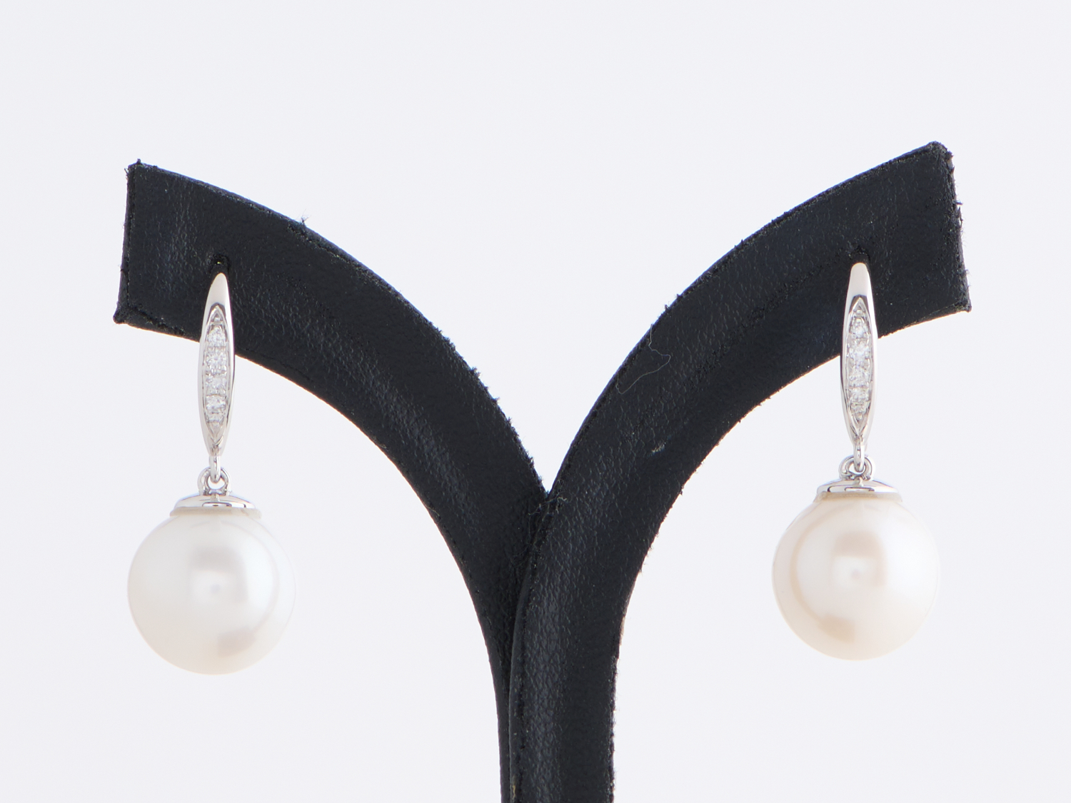 A PAIR OF PEARL AND DIAMOND EARRINGS IN 18CT WHITE GOLD, THE PEARLS MEASUIRNG APPROXIMATELY 11.97MM, TO SHEPHERDS HOOK FITTINGS