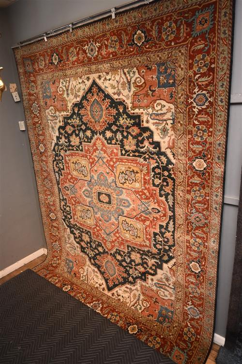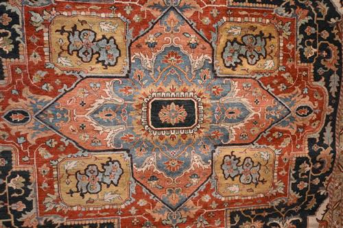 PRISTINE & MOST ATTRACTIVE PERSIAN SERAPI HERIZ DESIGN, VERY FINELY HAND-KNOTTED WITH THE FINEST HAND SPUN WOOL AND NATURAL DYES, NEW GALLERY CARPET BEING OFFERED. THE CARPET IS PERFECTLY BALANCED IN COLOUR & DESIGN IN TONES OF RUST, PEACH, LIGHT BLUE & INDIGO BLUE. CENTRED WITH A SOFT BLUE MEDALLION. EXTREMELY HARD WEARING, IN PRISTINE NEW CONDITION AN ABSOLUTE DESIRABLE CARPET FOR ALL SETTINGS. SIZE: 362 X 273 CM RRP $14,000 ORIGIN: AGRA TAJ MAHAL PROVINCE DOCUMENTATION OF AUTHENTICITY INCLUDED.