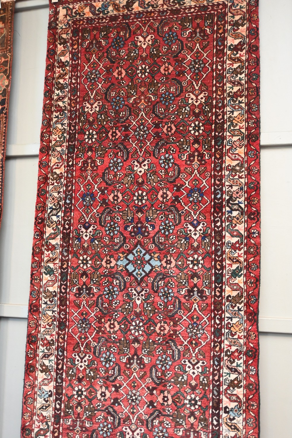 A LOVELY PERSIAN ENJELAS HALL RUNNER, 100% WOOL. DENSE & SOLID PILE IN GOOD CONDITION. HAND-KNOTTED VILLAGE WEAVE FROM THE HAMADAN REGION WITH TRIBAL DESIGN OF A CENTRAL FLORAL MEDALLION IN A RED FIELD OF ALL OVER HERATI MAHI PATTERN. BORDER OF FLOWER HEADS AND TRIBAL MOTIFS. SOFT MELLOW TONES. SIZE: 302 X 109 CM ORIGIN: PERSIA - RRP: $1,900 DOCUMENTATION OF AUTHENTICITY INCLUDED.