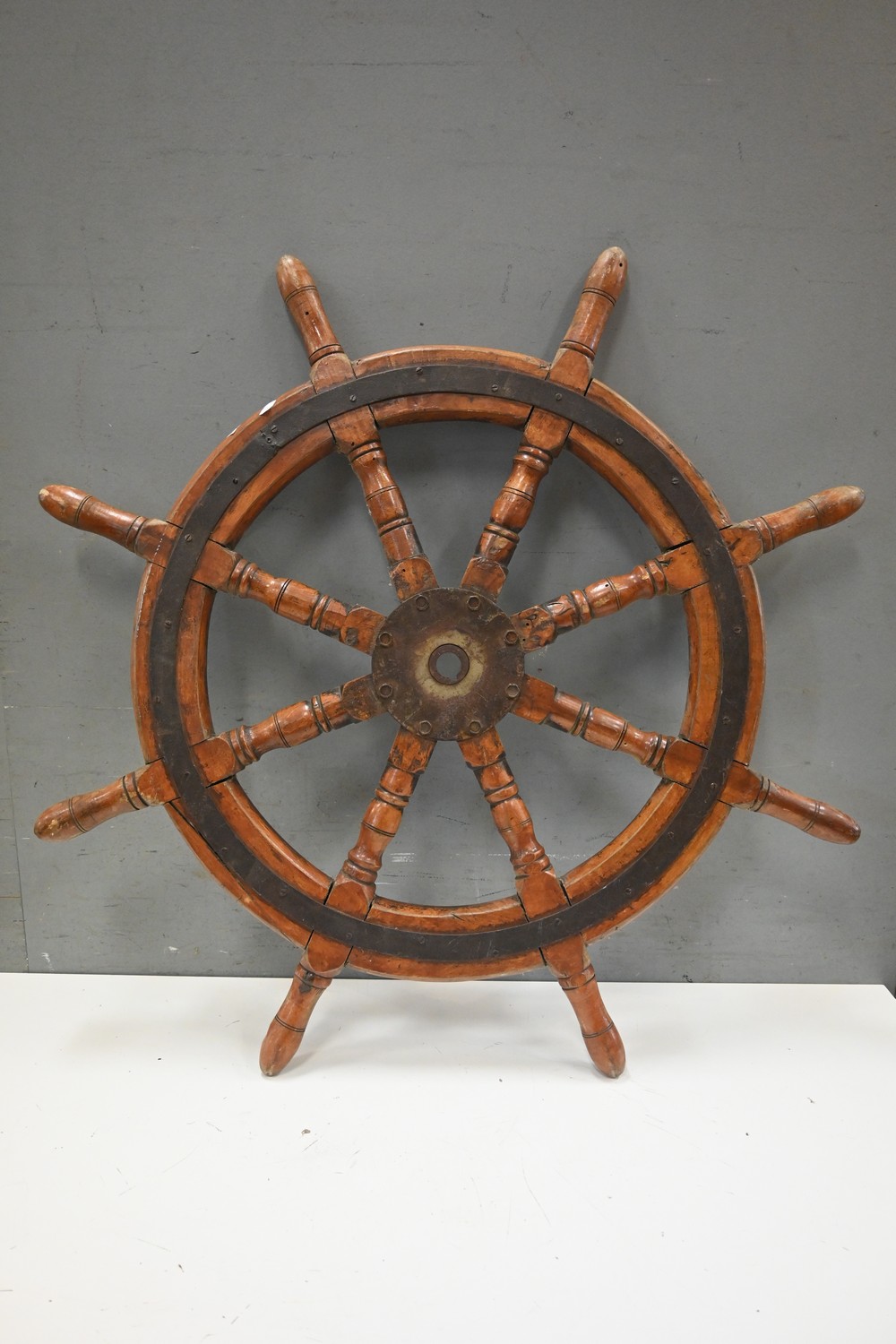 A VINTAGE SHIP'S WHEEL (94D CM) (LEONARD JOEL DELIVERY SIZE: LARGE)
