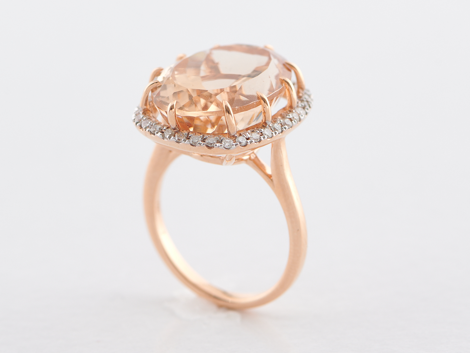 A MORGANITE AND DIAMOND RING IN 18CT ROSE GOLD, THE MORGANITE WEIGHING 13.14CTS, THE DIAMONDS TOTALLING 0.25CTS, RING SIZE L