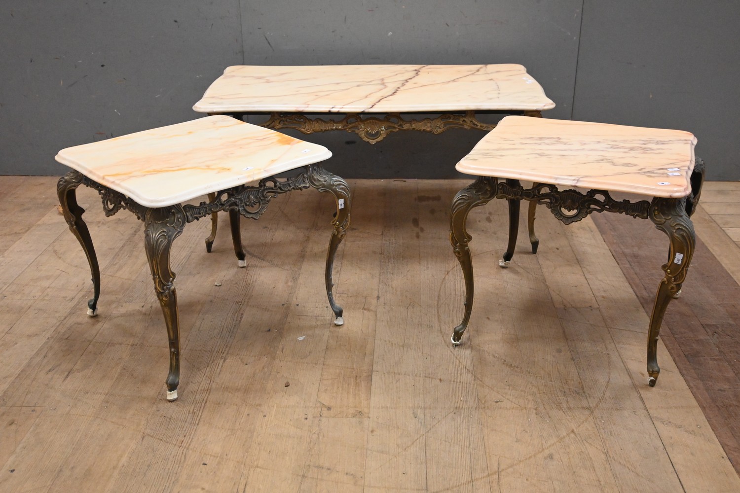 A SET OF THREE MARBLE AND METAL ITALIANATE COFFEE TABLES (A/F) (43H X 100W X 60D CM) (PLEASE NOTE THIS HEAVY ITEM MUST BE REMOVED BY CARRIERS AT THE CUSTOMER'S EXPENSE. LEONARD JOEL STAFF CANNOT ASSIST CARRYING THIS ITEM) (X-LARGE ITEM)
