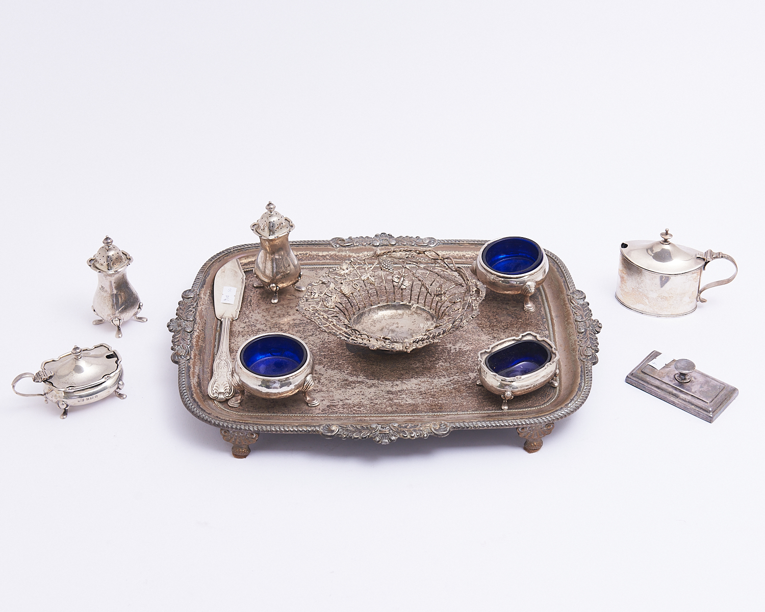 A GROUP OF STERLING SILVER TABLEWARE INCLUDING A PAIR CRUETS, TWO PAIRS OF SALTS, SUGAR BOWL, TOGETHER WITH AN EP TRAY AND PIERCED EP BONBON DISH W.36CM, LEONARD JOEL LOCAL DELIVERY: SMALL